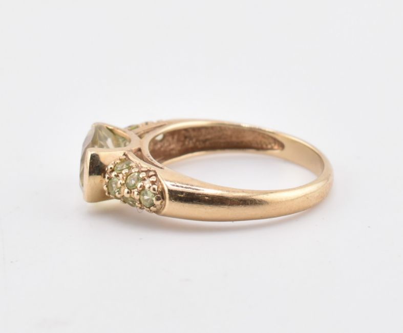 A hallmarked 9ct gold lemon citrine and peridot ring. The 9ct yellow gold ring having a half bezel set oval cut lemon citrine to shoulders set with twelve pave set round cut peridot to tapered shank. Hallmarked for Birmingham, 2007. With certificate. Size N. Weighs 3.0g. All weights, measurements and sizes are approximate.