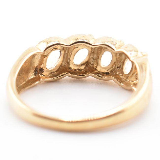 A hallmarked 9ct gold Sri Lankan rainbow moonstone four stone ring. The 9ct yellow gold ring set with four oval cut Sri Lankan rainbow moonstones to tapering shank. Hallmarked for Birmingham, 2006. Sponsor's mark DK. Weight 3.5g. Size: N. With certificate. All weights, measurements and sizes are approximate.