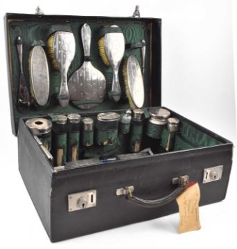 An Edward VII hallmarked silver twenty five piece travelling vanity case. The lot to include a hallmarked silver backed five-piece mirror and brush set, two ring footed boxes, eight silver cap / lid cut glass vanity bottles, a soap dish, a card holder with a pen, a travel clock, two travel ink wells, a match holder / striker, a hallmarked silver handled shoehorn and a hallmarked silver button hook and a hallmarked silver handled glove stretcher. Comes with fabric cover B.I.S. N Co from Calcutta to London.