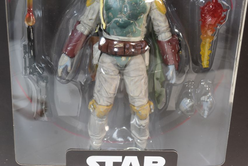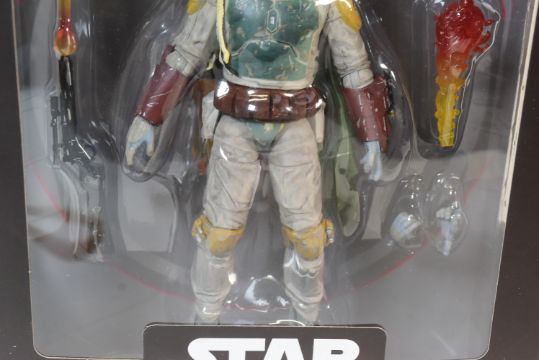 Star Wars - Boba Fett - x2 boxed larger scale action figures. Diamond Select / Gentle Giant 7" scale 'Boba Fett' boxed action figure and The Black Series Return Of The Jedi Boba Fett 6" scale action figure. Both factory sealed, contents mint.