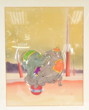 Dumbo (1941 Walt Disney) - scarce original production used hand pianted celluloid animation cel from the circus scene, depicting the elephants balancing atop a ball. Framed, along with original information to rear - 'Dumbo The Circus Elephant... is one of a select few that have been released to art collectors, the remainder have been destroyed. Of this series only 33 are available'. Some paint seperation and mild deformity from age, but the cel exists in good displayable condition and has been framed for many years. Total size: 60cm x 50cm.