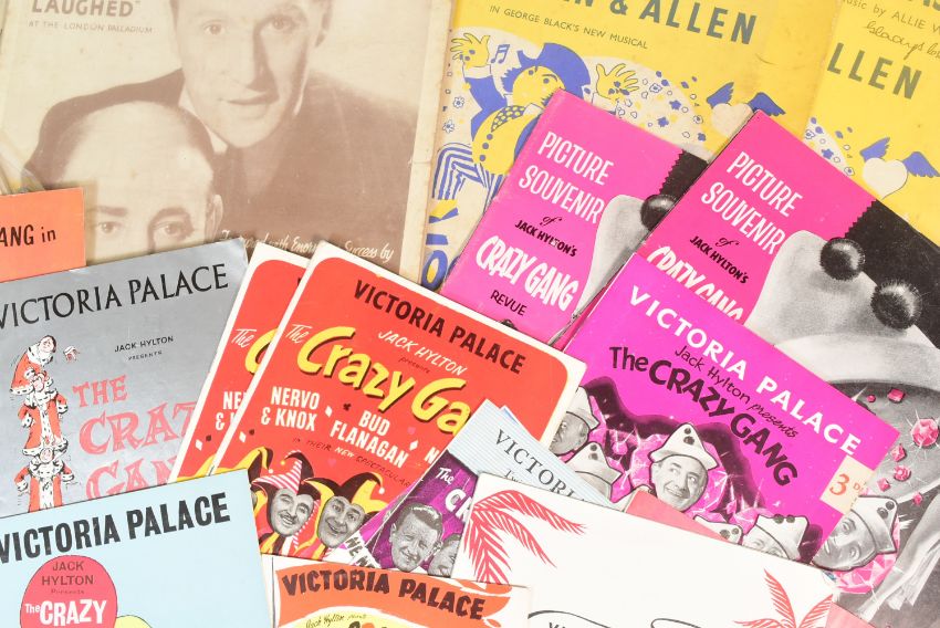 'Monsewer' Eddie Gray (1898-1969 - English stage comedian and member of The Crazy Gang) - a collection of Gray's personal stage props and other items, including: an original stage-worn sprung top hat by Henry Heath Ltd of London, an original unused Moustache made exclusively for him, and a pair of his stage-worn spectacles housed in their original case. Also included are a set of orchesta sheet music covers, all embossed 'Monsewer Eddie Gray'. Some containing original sheet music, doodlings or notes. Along with a collection of Crazy Gang memorabilia - a 1934 London Palladium programme, various other 1930s / 1940s programmes, 'Ring Out The Bells' programme, sheet music and other items. A unique collection.