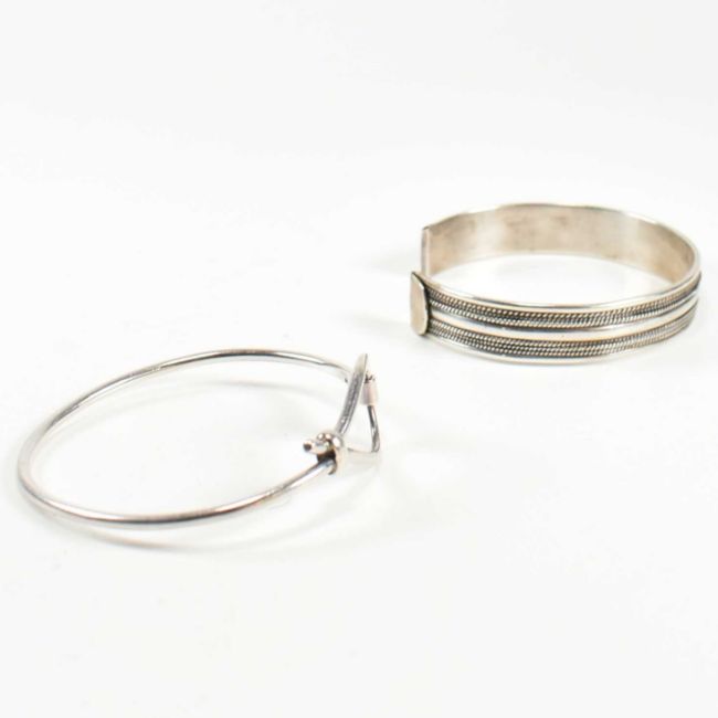 Two silver bangles. The lot to include a hallmarked silver bangle with loop clasp, hallmarked with import mark for Birmingham, 1998. A silver open bangle with twisted wirework decoration, hallmarked silver with foreign mark. Bracelet inner diameters measure 6cm and 6.3cm respectively. Weighs 43.1g. All weights, measurements and sizes are approximate.