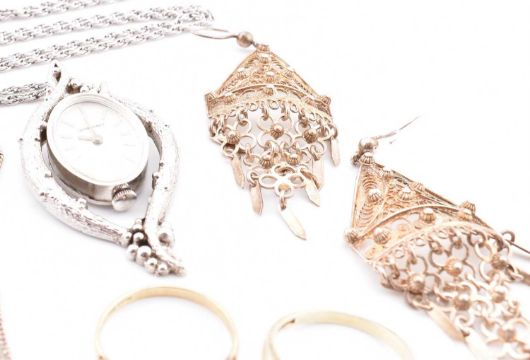 A collection of silver and gem set jewellery including a metal pendant watch necklace. The lot to include a pair of Italian silver filigree pendant earrings with French hook clasps, marked 925 to verso. A silver and CZ cross pendant strung on a 925 silver curb link chain necklace, marked 925 and CZ to pendant verso. A hallmarked silver gilt and gem set cluster ring, hallmarked for Birmingham. A hallmarked silver gilt and gem set five stone ring set in a pierced mount spelling 'ALWAYS' on one side and 'FOREVER' on the other, hallmarked for Birmingham. The lot to also include a 925 twisted fancy link chain necklace strung with a metal Jean Renet pendant watch, chain necklace marked 925 to spring ring clasp. Metal watch unmarked. Rings measure S.5. Earrings measure 7cm x 2.5cm. Cross pendant necklace measures 46cm. Pendant watch necklace chain measures 66.5cm. Watch measures 6cm x 2.9cm. Total lot weight 55.4g. All weights, measurements and sizes are approximate. All watches are sold as untested, therefore without warranty.