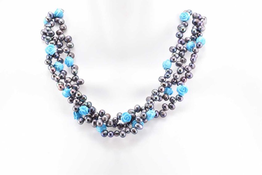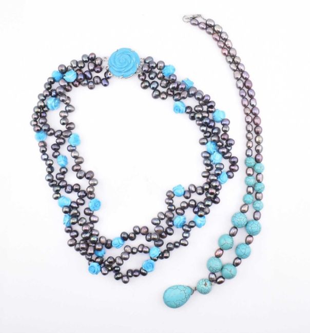 Two pearl and howlite necklaces and a pair of carved flower stud earrings. The lot to include a necklace comprised of three strands of pearls and howlite beads carved in the form of a rose to decorative carved rose howlite box clasp, unmarked surface tests do not indicate silver. A matching pair of carved howlite stud earrings in the form of rose buds with straight posts and butterfly back fasteners, marked 925. The lot to also include a pearl and howlite beaded pendant necklace with lobster claw clasp. Necklaces measure 46.5cm -48cm. Earrings measure 1.1cm x 1cm x 1.7cm. Weighs 165.2g. All weights, measurements and sizes are approximate.