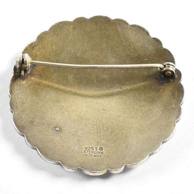 A Norwegian silver enamel winter scene brooch pin. The brooch pin with guilloche enamel decoration of a reindeer pulling a sled in a winter landscape. Marked for 925s Sterling Norway for Hjortdahl. Weight 18.5g. Measures 4.2cm. All weights, measurements and sizes are approximate.