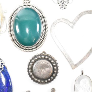 A collection of silver and gem set necklace pendants. The silver necklace pendants to include a pierced silver heart, malachite, moonstone, mother of pearl, black enamel, butterfly, agate and more. All pendants hallmarked silver, marked 925 or tests as silver. Measures largest 7cm x 4.1cm. Smallest 1.4cm x 0.7cm. Weighs 112g. All weights, measurements and sizes are approximate.