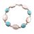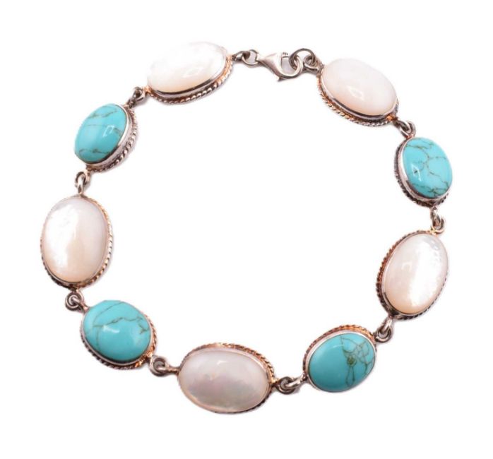 Two silver panel bracelets set with turquoise, moonstone and mother of pearl. The bracelets to include a silver and moonstone panel bracelet comprised of bezel set moonstone cabochon links to lobster claw clasp fastener, marked 925 to clasp. The lot to also include a silver, mother of pearl and turquoise panel bracelet, marked 925 to panel verso and lobster claw clasp. Bracelets measure 19cm -19.7cm. Combined weight 27.7g. All weights, measurements and sizes are approximate.