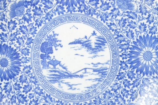 A 19th-century Japanese porcelain plate / dish, with a blue and white floral design, with a Japanese river / lake landscape featured to the center. Measuring approx. 29cm in diameter.