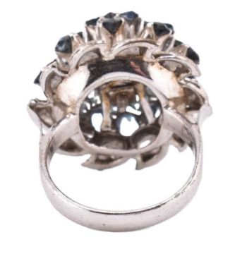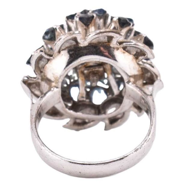 An 18ct white gold and sapphire cluster ring. The large cluster 23 graduating marquise cut sapphires with a round cut sapphire atop (24 stones total) Largest marquise measuring approx 6mm x 3mm, medium marquise measuring 4mm x 2.5mm, smallest approx 3mm x 2mm. Round cut stone atop 4mm diam. Set over a halo of leaves to pierced shoulders and plain band ring. Stamped 18k. Total gross weight 7.72g. All weights, measurements and sizes are approximate.
