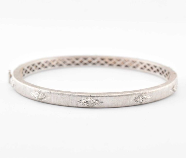 An Italian 18ct white gold and diamond hinged bangle. Stamped Italy & 750, the bangle inset with diamonds, estimated diamond weight 1ct. Weight 21.2g. Size 6.1cm inside diameter. All weights measurements and sizes are approximate.