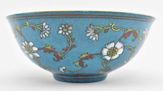A pair of 20th century turquoise ground enamelled bowls. Each footed bowl decorated with lanterns and floral design to the interior and exterior, folur characters marked to the base.