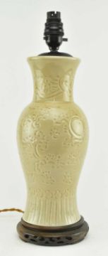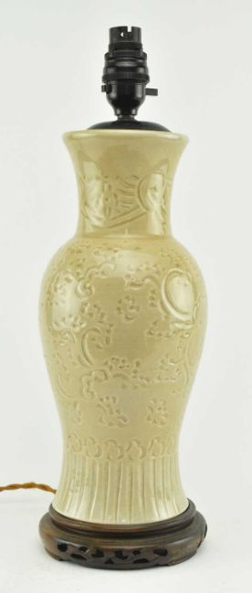 A vintage 20th century Chinese celadon ware vase converted to a lamp. The baluster vase with flared rim fitting with ebony light fixture, the body of the vase with incised pattern. Raised on hardwood stand. Sold as untested.
