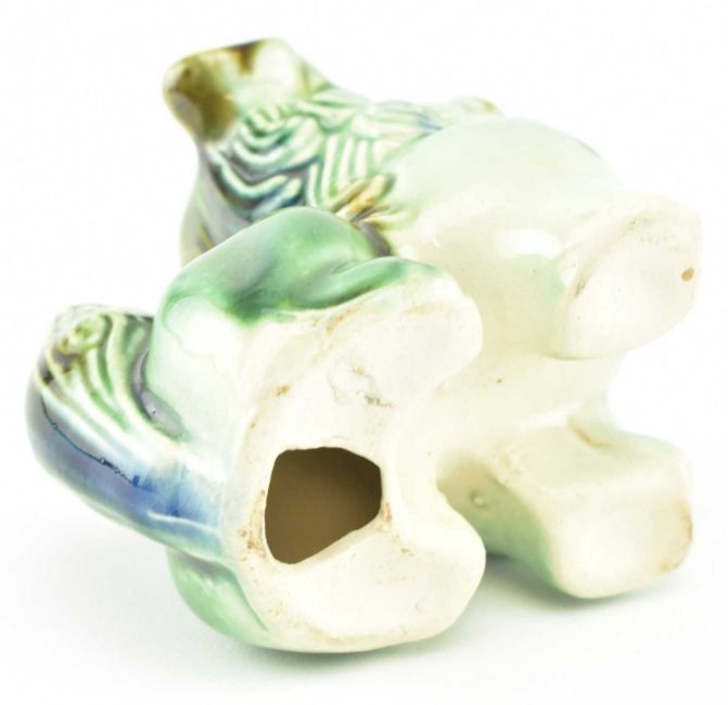 Two vintage Chinese green glazed porcelain pieces. The lot to include a green glazed censer decorated with moulded foliage rim and relief dragon to the body. Together with a vintage green-aubergine glazed foo dog.