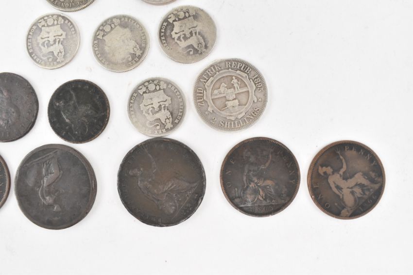 A collection of eighteen 19th & 20th century coins. The lot to include an 1854 four pence, 1897 1 shilling coin with mount hole, three 1826 shillings, 1895 2 South African shillings, very worn George cartwheel penny, & others.