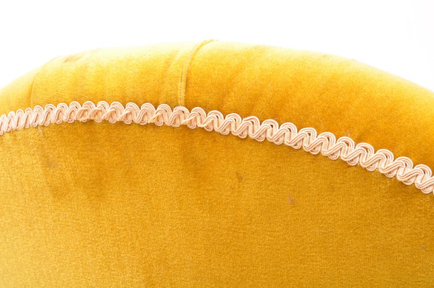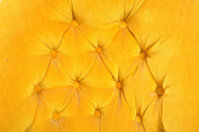 A late 19th century Victorian fireside buttonback tub chair. The chair having mustard yellow buttonback upholstered body, raised on carved cabriole legs to front.