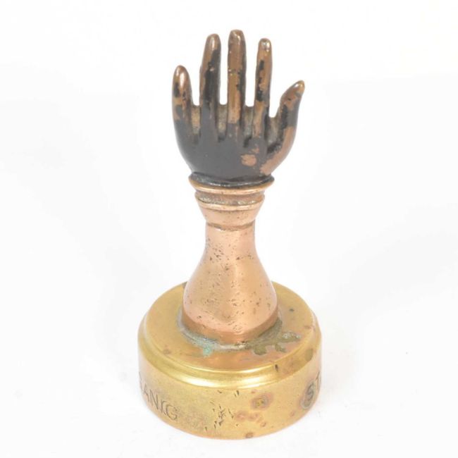 St John's Black Hand Gang - an unusual believed military interest small brass paperweight / seal depicting a black sleeved hand, mounted on a round base and engraved 'St Johns Black Hand Gang'. Little is known of 'St Johns Black Hand Gang' and several late 19th / early 20th century groups were referred to as the 'Black Hand Gang'. Possibly relates to the East Yorkshire regiment during the First World War. Measures approx: 8cm tall.