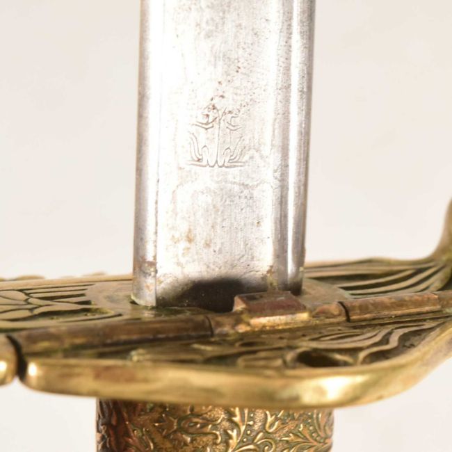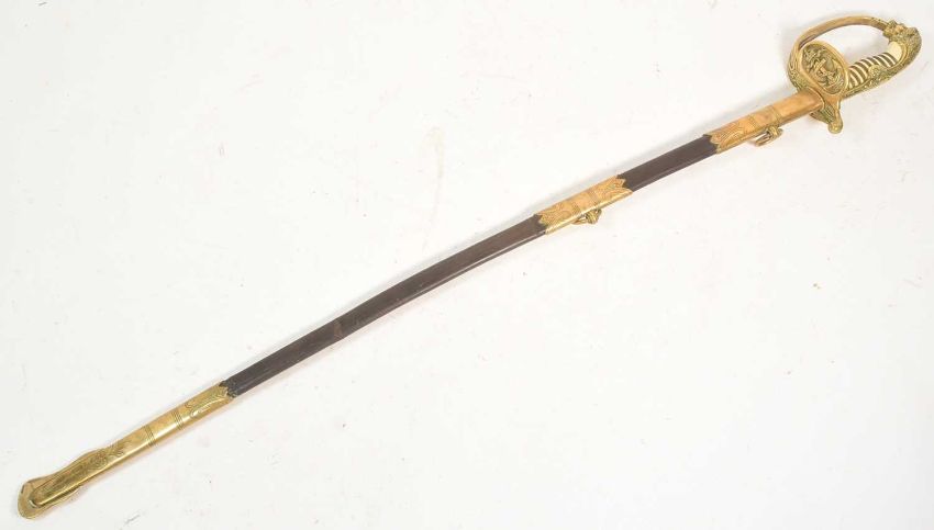 A WWI First World War Imperial German Naval Officers dress sword having a brass lion head pommel with red and green glass inset eyes, wire bound grip and fold down guard with fouled anchor. The Damascus blade bears the makers name ' Eisenhauer '. Housed in the original scabbard. Measures approx 88cm.