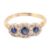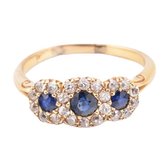 An 18ct gold sapphire and diamond triple daisy cluster ring. The 18ct yellow gold cluster ring having three graduating round cut sapphires surrounded by halos of round brilliant cut diamonds in the form of three daisies to scrolling shoulders and tapered shank. Marked 18ct to inner shank however rubbed. Size O. Weighs 3.4g. All weights, measurements and sizes are approximate.