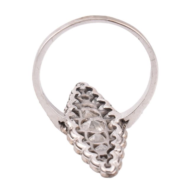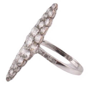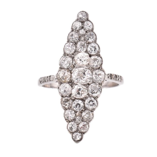A hallmarked 18ct gold and navette diamond cluster ring. The ring having a navette shaped head set with 35 diamonds largely old cut diamonds with rose cut diamond accents set within silver with a gold under bezel and shank. The shank likely a replacement having diamond set shoulders hallmarked for 18ct gold Birmingham. Weight 3.1g. Estimated diamond weight 2.75 - 3ct. With associated Insurance valuation from Mallory of Bath. Size Q. All weights, measurements and sizes are approximate.
