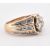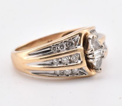 A gold and diamond fancy cluster ring. The yellow gold ring set with a central east-west baguette cut diamond flanked to the top and bottom by two trilliant cut diamonds to shoulders set each with nine graduating round brilliant cut diamonds. Marks to inner shank illegible. Size R. Weighs 7.4g. All weights, measurements and sizes are approximate.