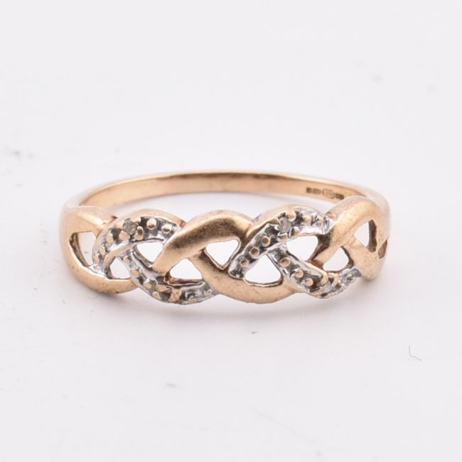 A hallmarked 9ct gold and diamond ring AF. The 9ct yellow gold ring having a pierced, weaved design set with three illusion set round brilliant cut diamonds to tapered shank. Hallmarked for Birmingham. Size L. Weighs 1.3g. All weights, measurements and sizes are approximate.