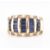 A 14ct gold blue and white sapphire dome ring. The yellow gold ring five rows of calibre blue sapphires flanked to the top and bottom by twelve round cut white sapphires to tapering shank. Stamped 585 to inner shank. Size L. Weighs 8.6g. All weights, measurements and sizes are approximate.