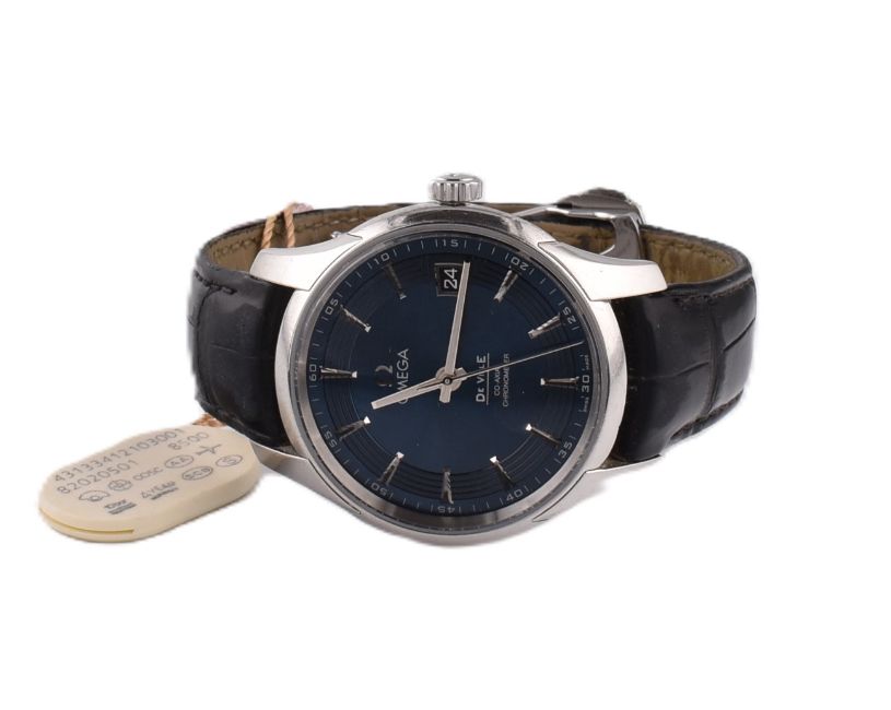 An Omega De Ville Hour Vision Orbis wristwatch. The Omega De Ville Hour Vision wristwatch having a blue dial, 18ct white gold baton indices and baton hands with date function at 3 o'clock to stainless steel case with black leather strap. Signed Omega De Ville, Co-Axial Chronometer to dial. The gentleman's Omega watch to come in the original Omega presentation box together with the instructions booklet, International warranty, Chronometer certificate and pictograms card in addition to the original purchase receipt. Case measures 5cm x 4cm (excluding crown). Measures 21cm. Weighs 83g. All weights, measurements and sizes are approximate. All watches are sold as untested, therefore without warranty.