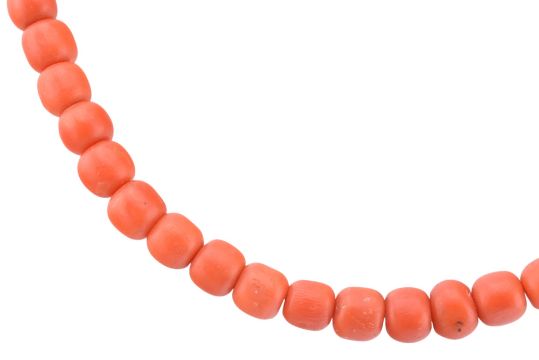 A 19th century coral bead necklace. The necklace formed with graduating coral beads having lately restrung - on a gold etched decorated barrel clasp. Clasp tests as 18ct gold. Measures 51cm. Beads 3mm - 5mm. Clasp 1.2cm