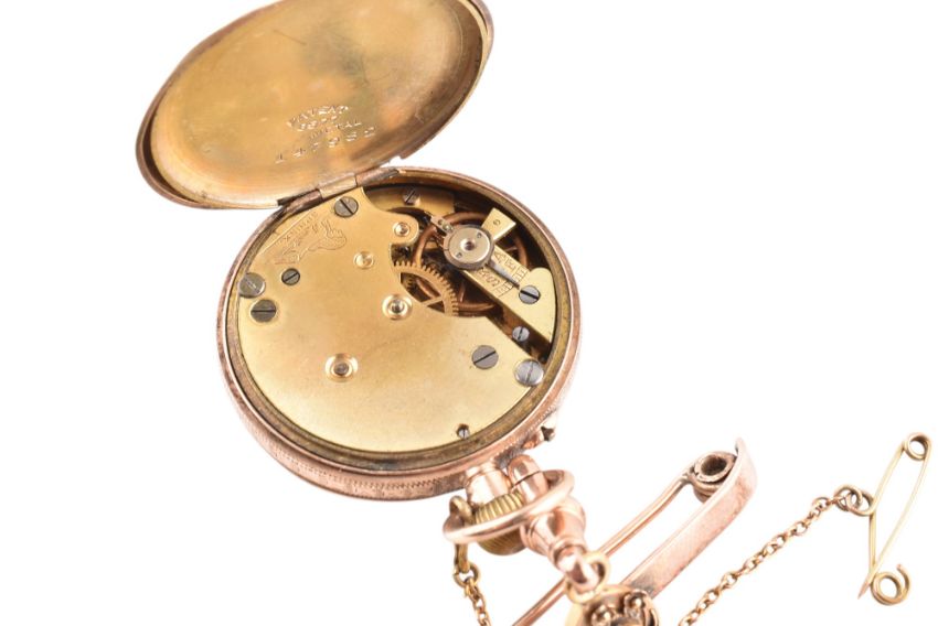 An early 20th century hallmarked 9ct gold Sphinx fob watch and heart brooch pin. The hallmarked 9ct rose gold sphinx fob watch having blued spade hands, Roman numeral indices, decorative gilded seconds track to engraved rose gold case with vacant cartouche verso. The fob watch surmounted by an antique 9ct rose gold brooch pin with heart motif set with a diamond chip and dog lead clasp to hinge pin verso. Watch hallmarked for with import mark for London, 1914. Brooch pin marked 9ct together with maker's mark W.W. Measures 7.3cm x 3cm. All weights, measurements and sizes are approximate. All watches are sold as untested, therefore without warranty.