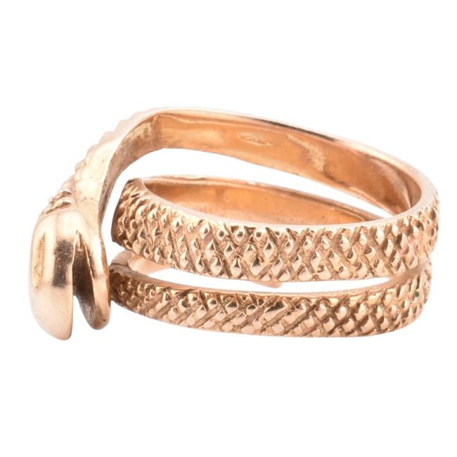 A 9ct gold snake ring. The 9ct gold ring in the form of a coiled serpent having a textured finish. Unmarked, surface tests indicate 9ct gold. Size O-O.5. All weights, measurements and sizes are approximate.
