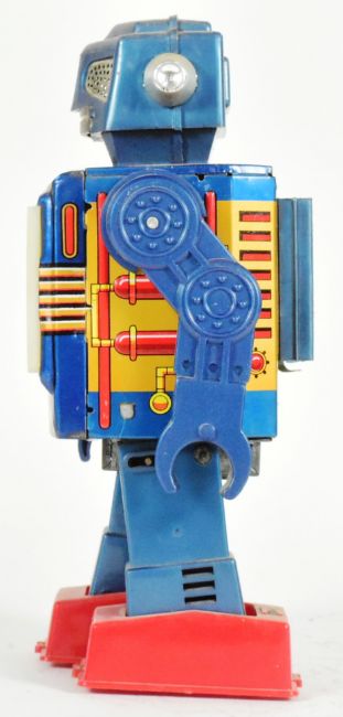 Tinplate Toys - a vintage Japanese SH Horikawa Video Robot. Featuring tv screen and walking action. Tested and not in working condition other than the light-up TV screen. Unboxed. Measuring approx. 24cm x 12cm.