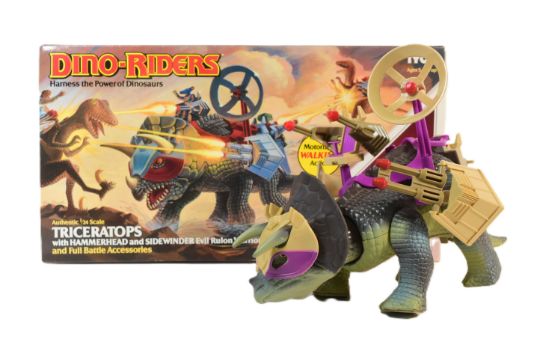 Dino Riders - an original vintage 1980s Tyco made Dino-Riders Triceratops dinosaur action figure playset with battle armour. Housed within a VG+ original box with inner packaging.