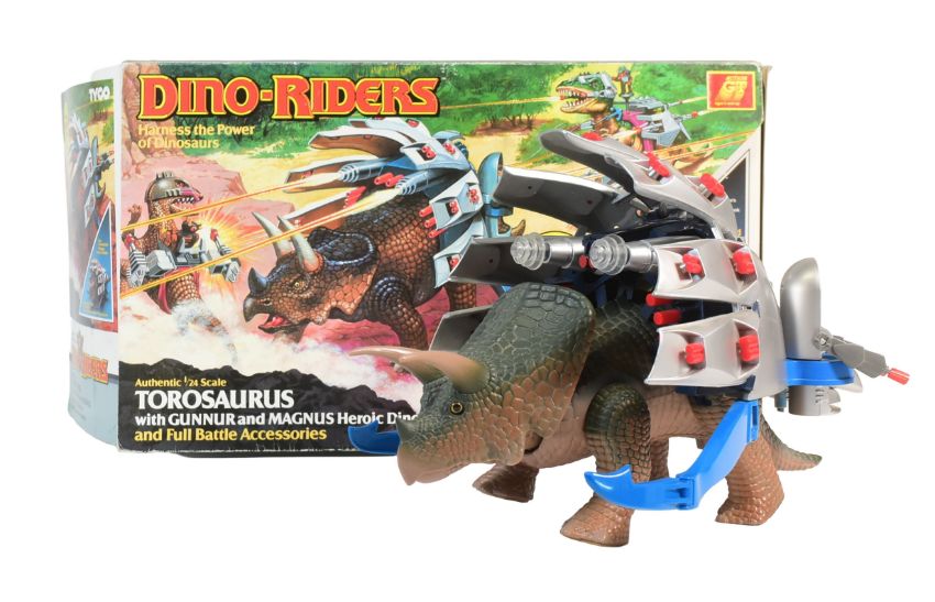 Dino Riders - an original vintage 1980s Tyco made Dino-Riders Torosaurus dinosaur action figure playset with battle armour. Housed within a VG+ original box and inner packaging.