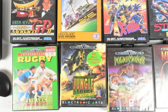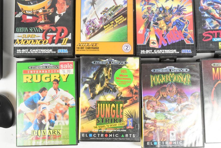 Retro Gaming - a vintage Sega made 16-bit Mega Drive gaming console with x2 controllers (x1 original) and a selection of games to include; Sonic, X-Men, Mortal Kombat, Streets of Rage, Jungle Strike, Alien, Monaco GP and more.