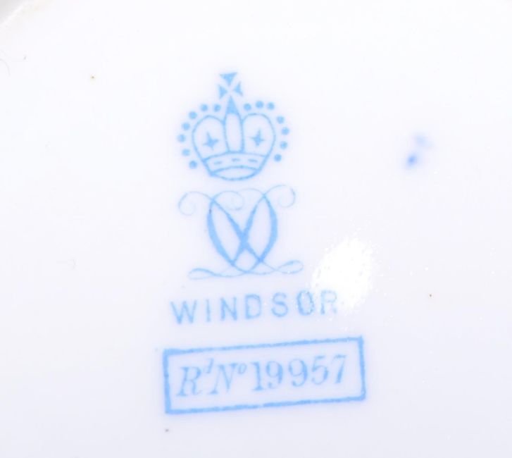 Windsor - Early 20th century bone china tea service. Comprised of nine tea cups, twelve saucers, twelve small plates, a milk jug and a large sugar bowl. The blue and white design featuring a floral pattern with gilt detailing. Numbered 19957 to the underside of each piece, with the makers mark. Tea cup measuring 6cm tall.