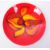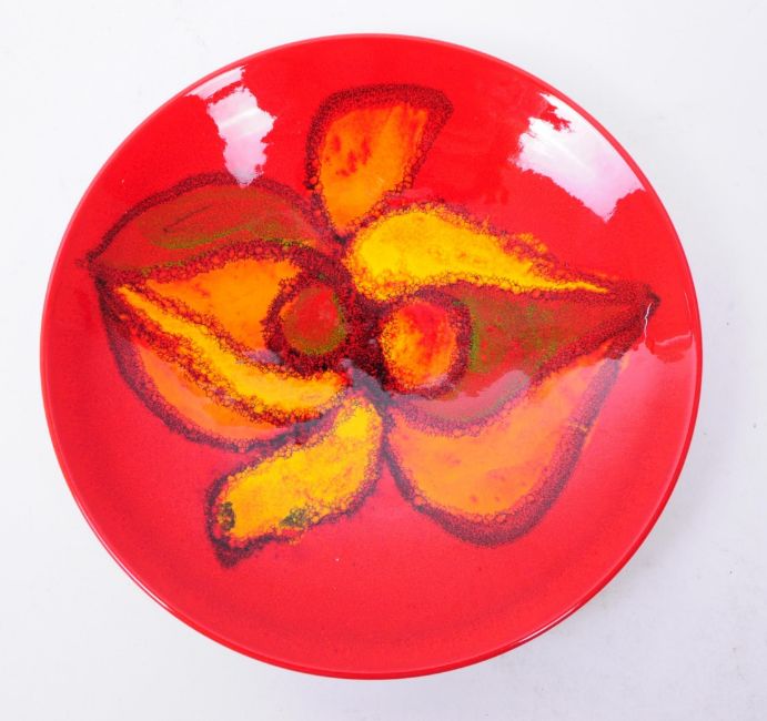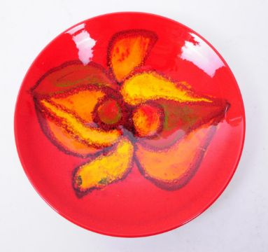 Three 1970s Poole pottery Delphis patterned pieces comprised of a bowl and two plates in a red and orange colourway. Poole makers mark printed to the underside. Largest piece measuring approx. 20cm in diameter.