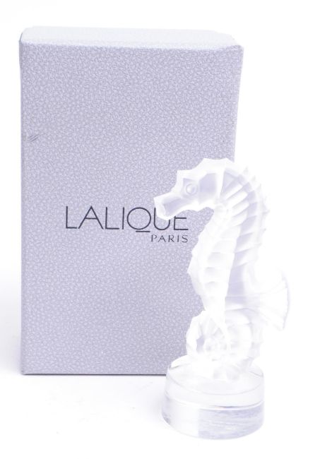 Rene Lalique (1860-1945) - Paris 'Hippocampe' seahorse clear glass paperweight figure. Signed to the base and housed within the original box. Measuring approx. 13cm x 8cm x 6cm.