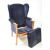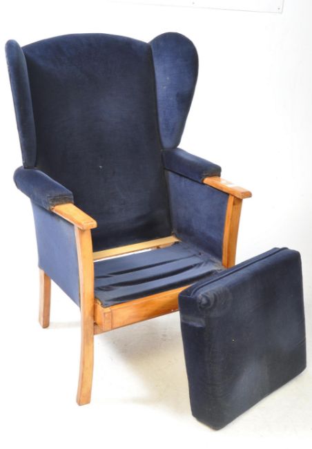 A late 20th century circa 1980s Queen Anne wingback armchair. Blue velour fabric with teak body, flat elbow rests with square upright legs. Measures approx: 100x60x50cm