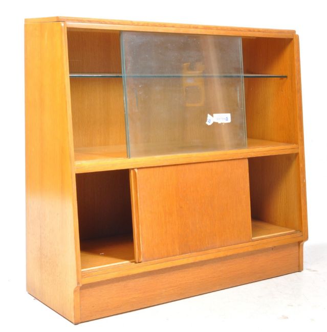 British Modern Design - Mid century oak bookcase cabinet. Features twin sliding glass doors over the cupboard beneath. Measuring approx. 85x90x35cm