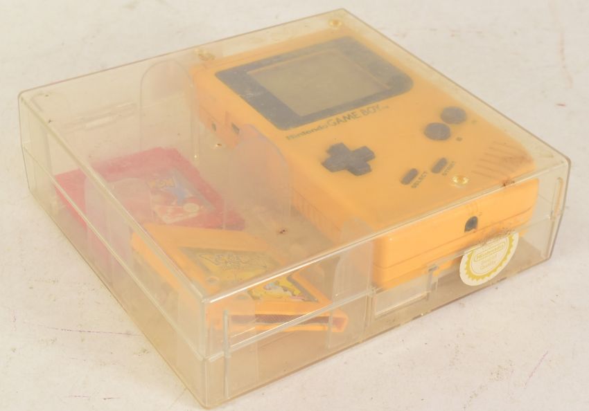 Retro Gaming - a vintage Nintendo Gameboy DGM-01 yellow together with Pokemon Red Version and Pokemon Special Pikachu Edition. Housed in original Nintendo perspex case.