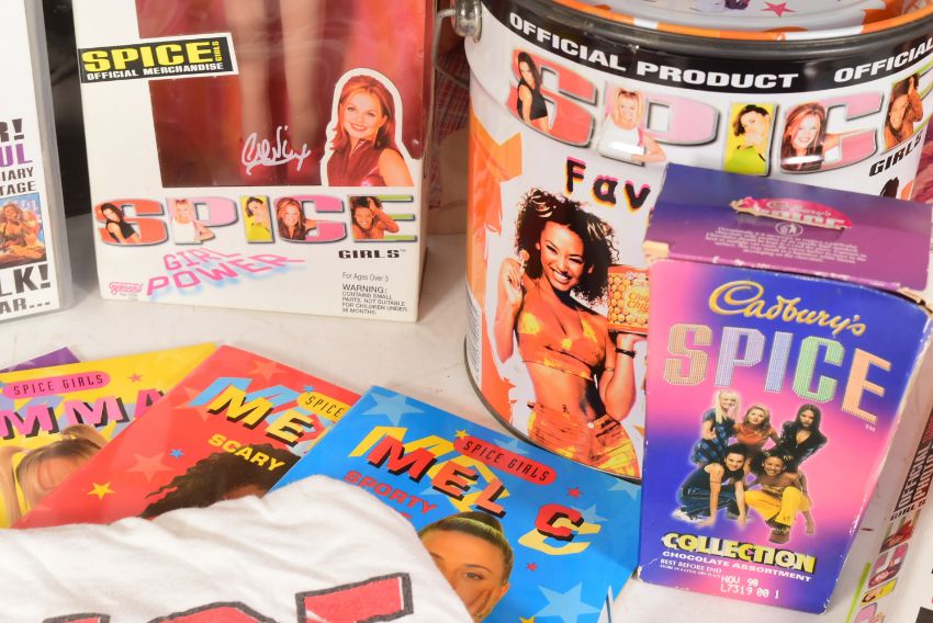 Spice girls - A collection of vintage 1990s Spice Girls memorabilia to include; 2x VHS, Spice World film VHS in limited edition tin, Ginger Spice (Geri Halliwell) doll in original box (opened), Chupa Chups tin with contents, childrens t-shirt, 'Forever Spice' photograph book, official photo album with photos, keyring and other ephemera.