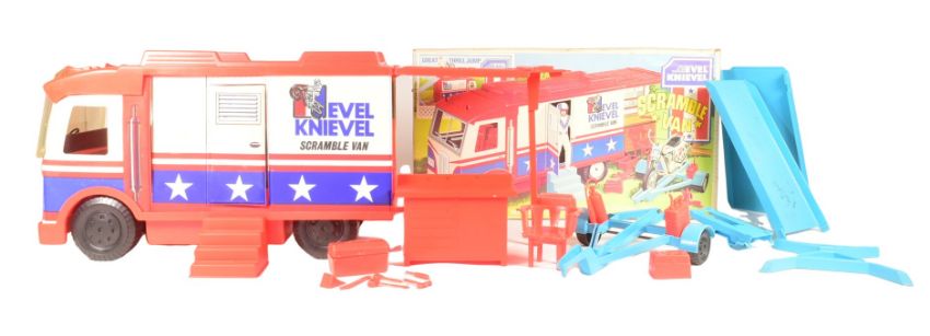 Retro Toys - a vintage Ideal made Evel Knievel Scramble Van action figure playset with jump ramp, cycle trailer, work bench and tools. Housed in the original box.