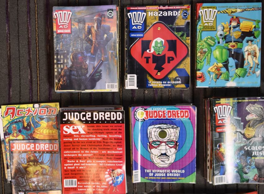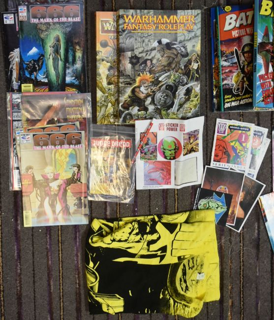 Comics - a large collection of vintage comics, annuals and other books. Largely early 1990s 2000AD / Judge Dredd together with Eagle, some free gifts / stickers, posters, Judge Dredd tshirt and more.