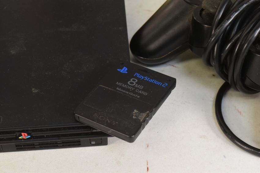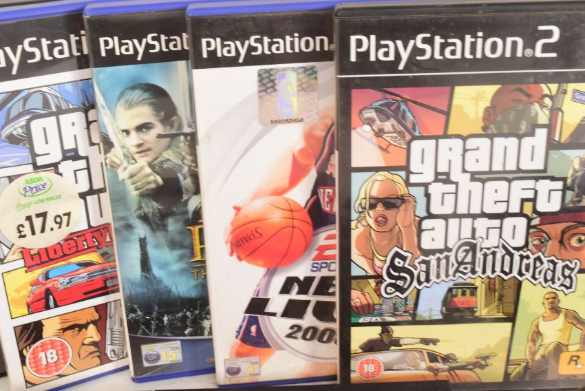 Retro Gaming - a vintage Sony PS2 Playstation 2 slim video game consoles together with controllers and games comprising; Grand Theft Auto: San Andreas, Grand Theft Auto: Liberty City Stories, The Getaway: Black Monday, FIFA 08, Lord Of The Rings and NBA Live.