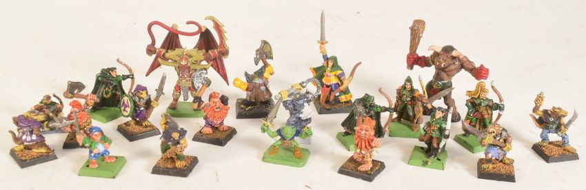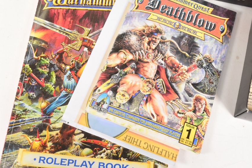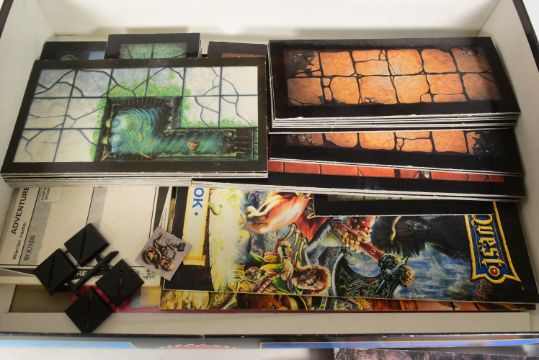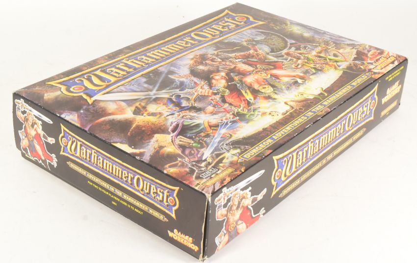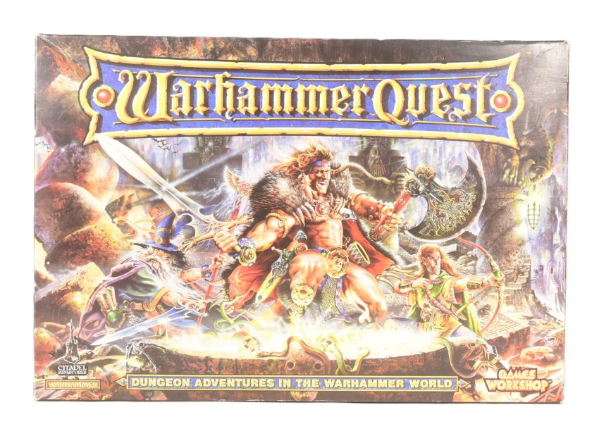 Warhammer - a vintage 1990s (1995) Games Workshop Warhammer Quest fantasy dungeon, role-playing adventure board game. The game containing the rule books, plastic dungeon doorways, plastic bases, counters and tokens, playing cards and more. Includes 21 painted Citadel Miniatures.