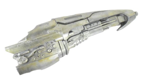 Doctor Who (BBC science fiction series) - The Ghost Monument (Thirteenth Doctor era) - an original screen used blaster from the episode. This type of gun was seen in the background throughout the episode. Resin construction, painted in silver and deliberately weathered to appear used, with an internal handle. No moving parts. Measures approx: 75cm long.