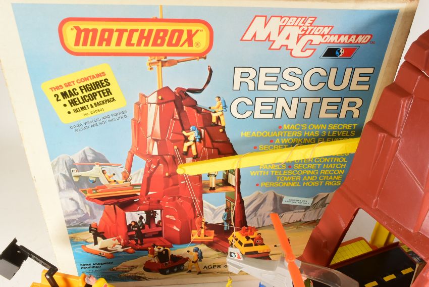 Retro Toys - a vintage 1970s Lesney made Matchbox Mobile Action Command Rescue Centre playset with Emergency Utility Unit and a x11 original figures. Retains outer box and x3 Action Jack boxes.