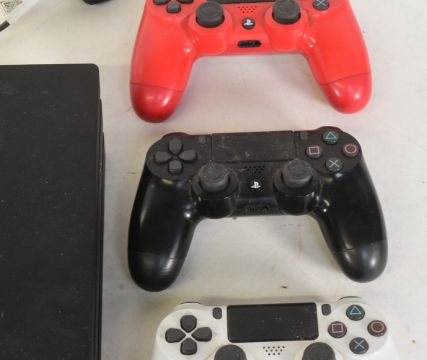 Gaming - an original Sony PS4 Playstation 4 video game console together with x4 wireless controllers.