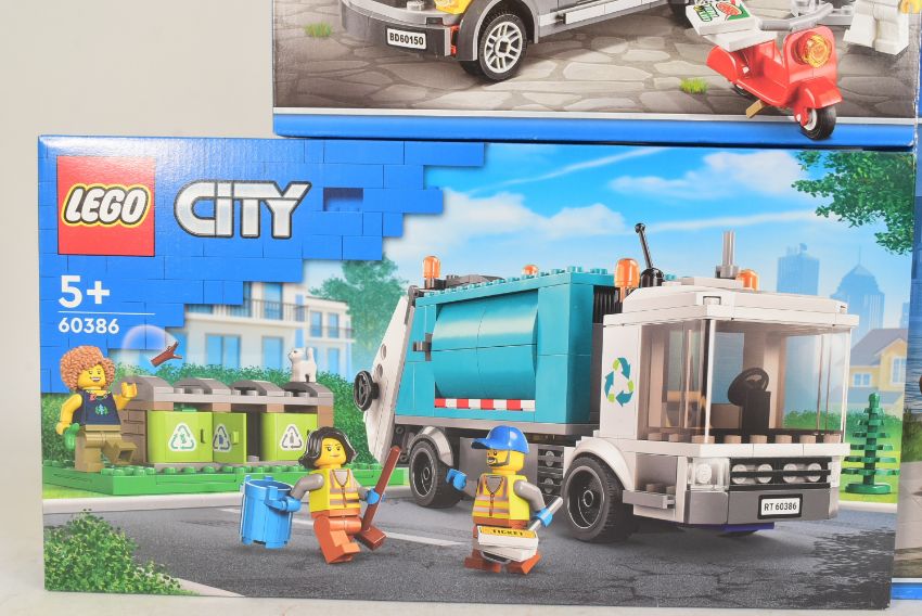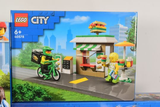 Lego - a collection of x4 factory sealed Lego City sets comprising; 60214 Burger Bar Rescue, 60386 Recycling Truck, 60150 Pizza Truck and 40578 Sandwich Shop. Retired products.